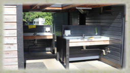 drie douches,twee wasplaatsen en twee afwasplaatsen aanwezig. In de overdekte ruime staat